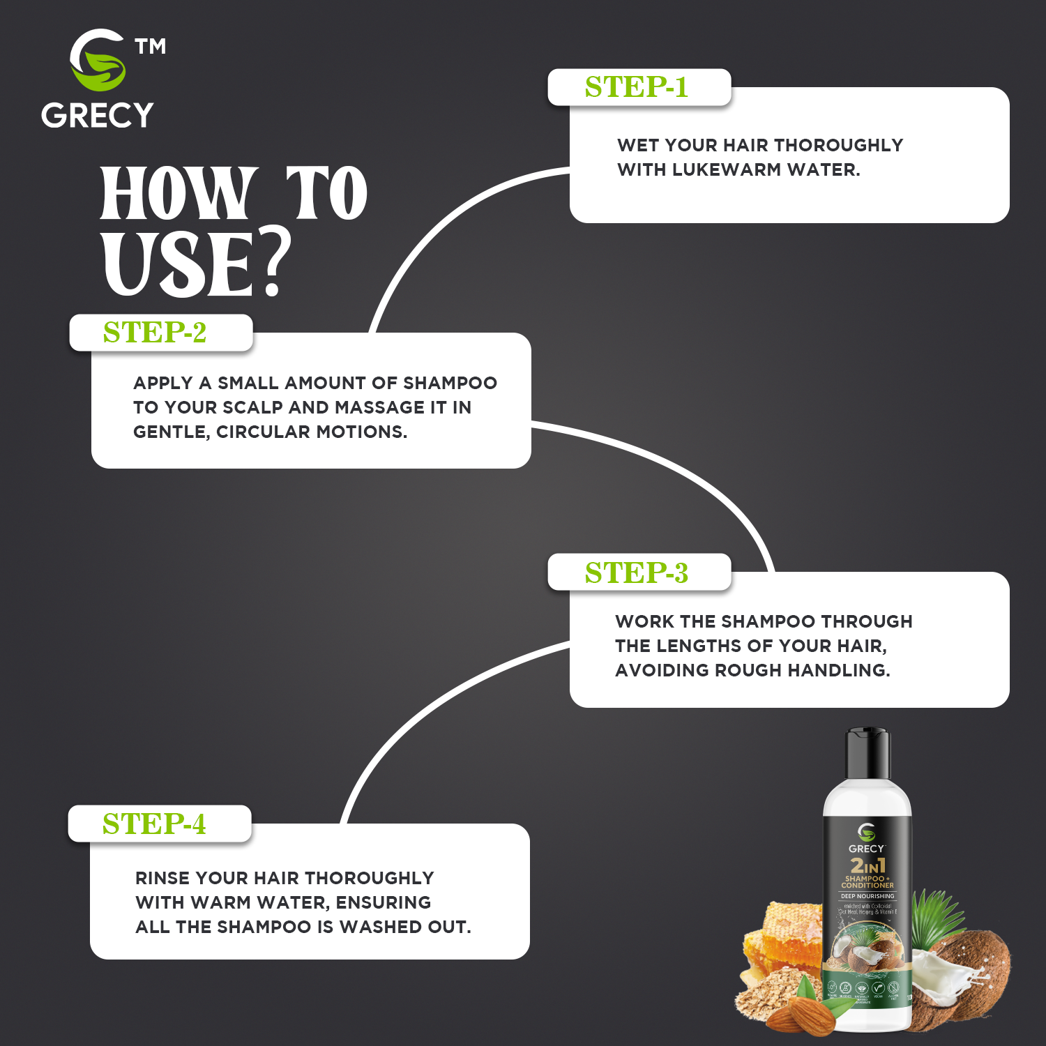 Product Name: Grecy 2 in 1 Shampoo with Conditioner Hair Type: All Hair Type Flavour: Coconut Net Quantity (N): 1 Introducing Grecy 2 in 1 Shampoo, a luxurious blend of nature's finest ingredients for stunning hair and scalp benefits. Infused with the goodness of Almond, Coconut, Milk, Colloidal Oat Meal, and Honey. this shampoo deeply nourishes, conditions, and revitalizes the hair. Experience the indulgence of soft, silky, and smooth tresses with every wash. The powerful combination of ingredients ensures optimal hydration, leaving your hair feeling luscious and rejuvenated. Pamper yourself with Grecy 2 in 1 Shampoo and unlock the secret to healthy, beautiful hair. It is also free of harsh chemicals and parabens, making it gentle enough for everyday use. Country of Origin: India